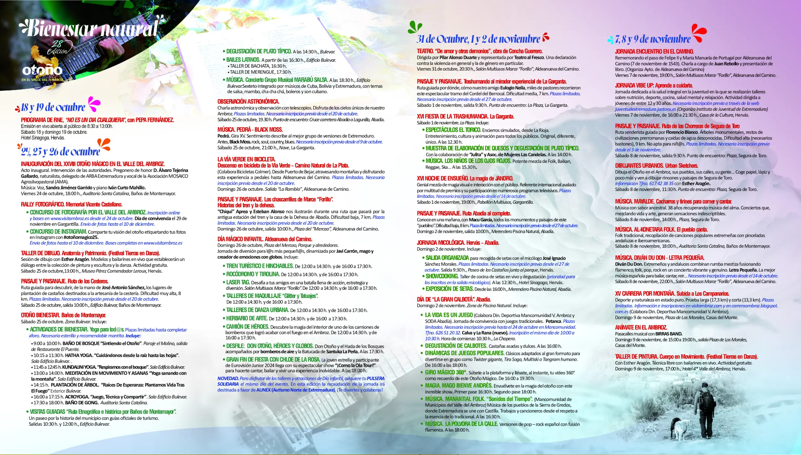 El Otoño Mágico celebra su 28ª edición con un programa amplio de cultura, naturaleza, deporte y gastronomía repartido por los pueblos del Valle del Ambroz durante todo noviembre y finales de octubre. Habrá inauguración oficial con pregón, conciertos, rutas senderistas y en bicicleta, talleres creativos y de bienestar, degustaciones de platos típicos y jornadas micológicas. Se mantienen las citas clásicas como la Fiesta de la Trashumancia, el Paseo y PasaVela, la Noche de Ensueño, el Día de la “Gran Bellota”, concursos de fotografía e Instagram y actividades infantiles y familiares.